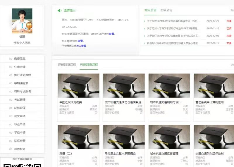 (蘇州大學自考助學平臺學生空間界面)