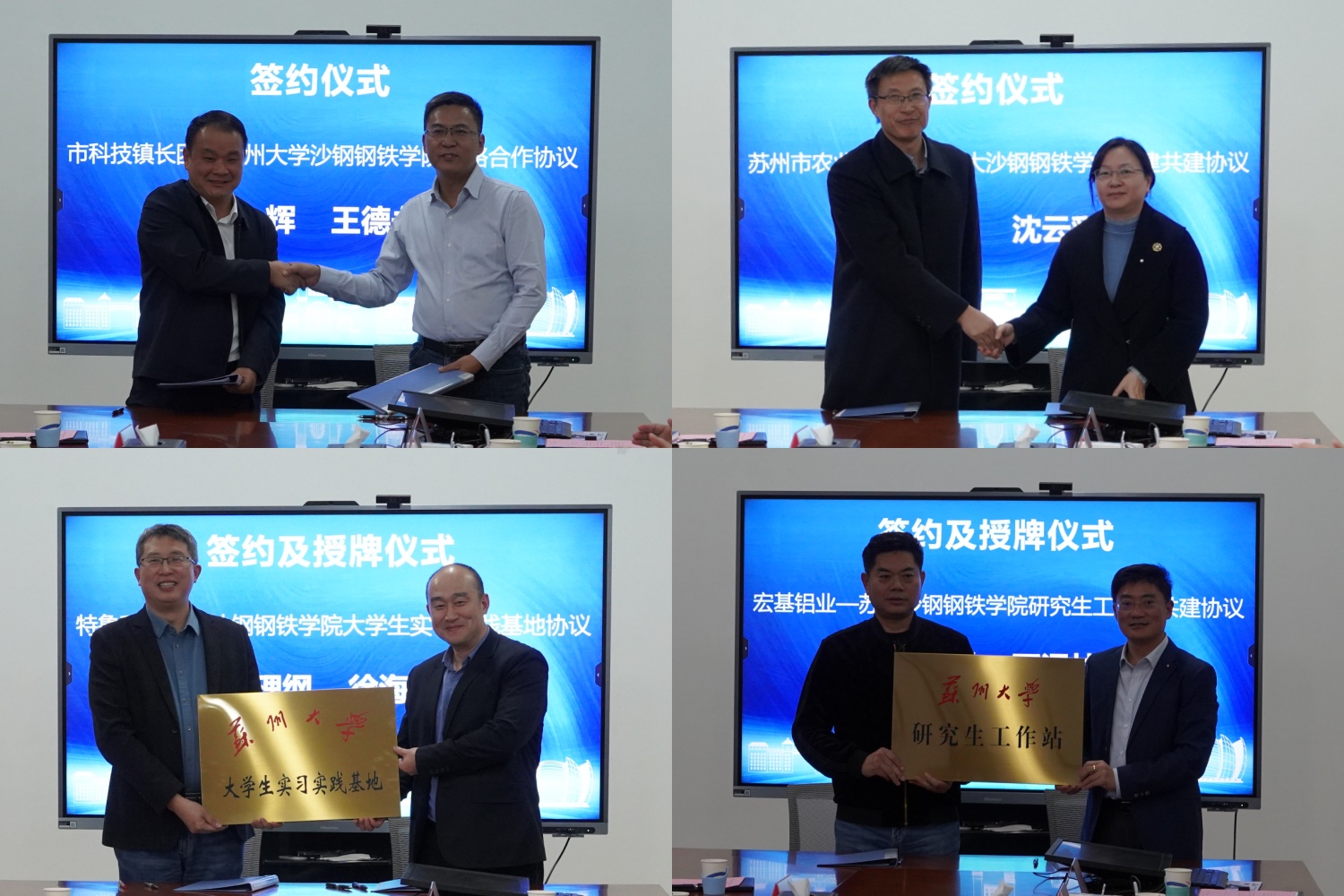 會上,王德永和姜輝分別代表沙鋼學院和市先進材料團簽署了合作框架協議,沈云彩和姜紅衛分別代表學院黨委和市農科院黨委簽署了黨建共建協議,徐海洋和張理綱分別代表學院與特魯利公司簽約共建大學生實習實踐基地并授牌,丁漢林和徐建祥分別代表學院與宏基鋁業簽約共建研究生工作站并授牌,為黨建活動的開展、大學生勞動教育和實習實踐、研究生專業實踐及后續多領域、深層次開展產學研活動,進一步深化產學研融合,促進教育鏈、人才鏈與產業鏈、創新鏈有機銜接等夯實了基礎。